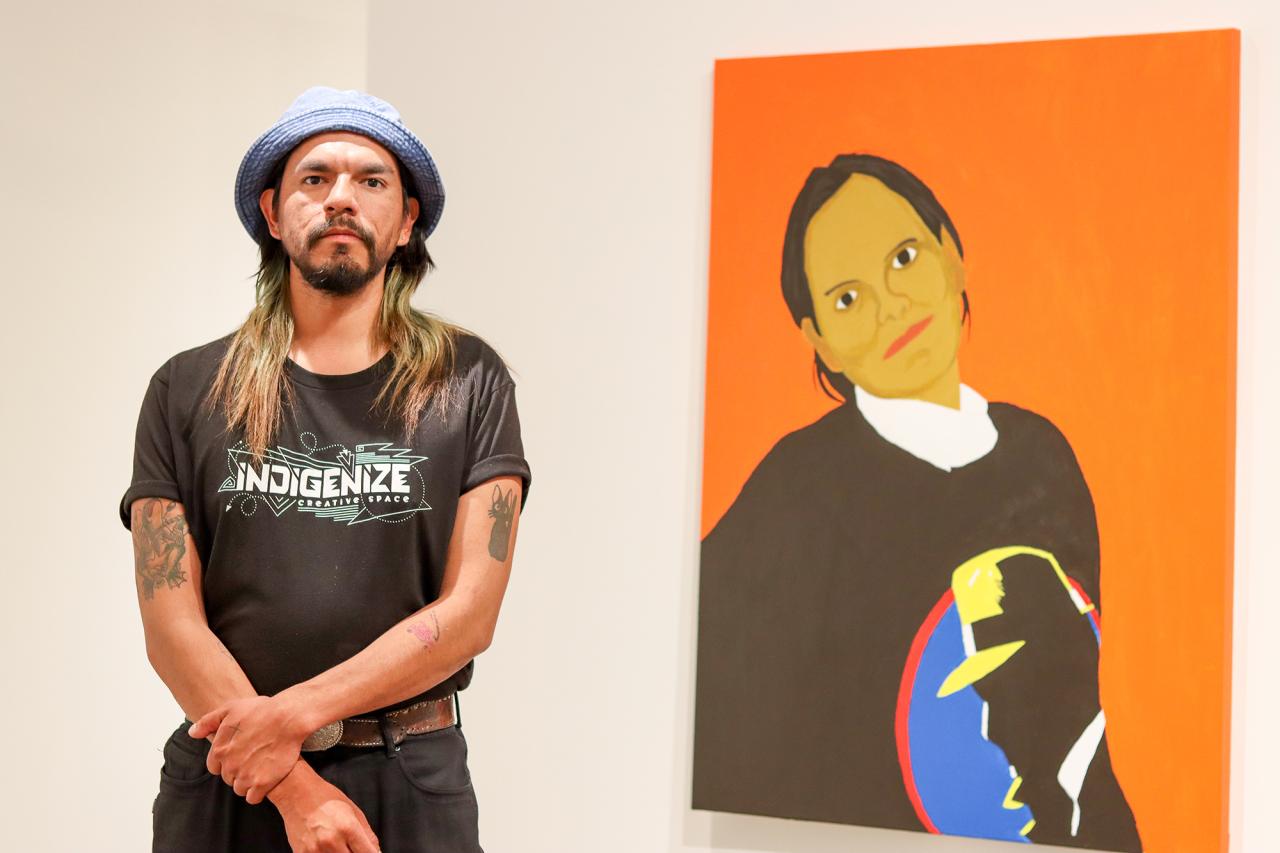 Atticus Mercredi stands in front of the painting of his mother.