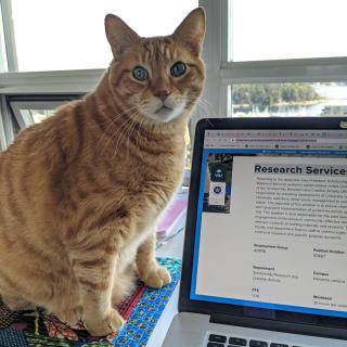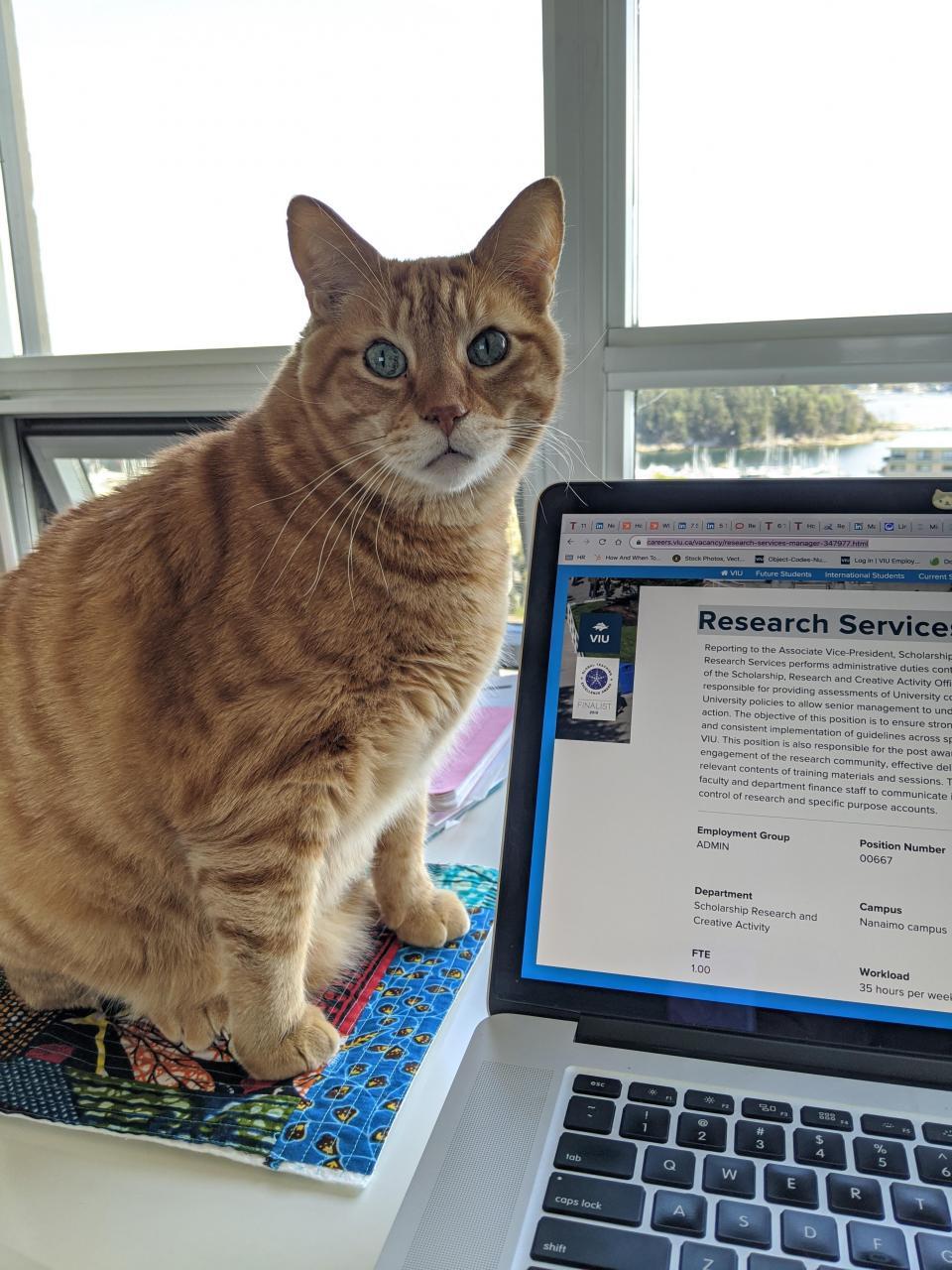 Fred has created an office in our den – creatively using cardboard boxes as a makeshift desk, pictured here with the support of our cat Rupert.