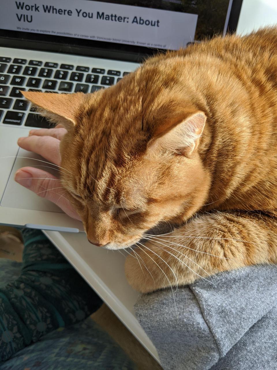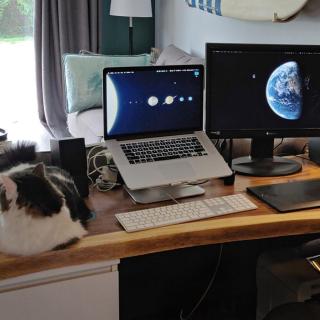 I cycle through the different rooms, using yoga props to create a work surface, pictured here with the support of our cat Rupert.